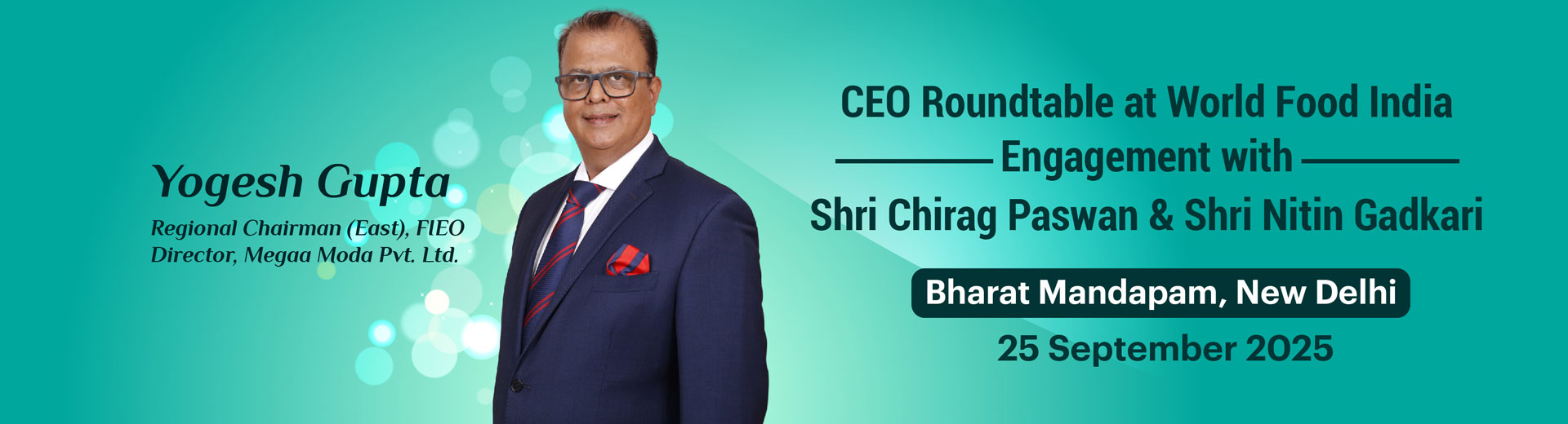 At a CEO roundtable on the sidelines of World Food India, Yogesh Gupta, Regional Chairman (East), FIEO, and Managing Director, Megaa Moda Pvt. Ltd., joined Hon’ble Minister for Food Processing Industries Shri Chirag Paswan, Hon’ble Union Minister Shri Nitin Gadkari, and 106 CEOs from the food sector. Discussions covered export potential, investment, processing capacity, logistics, and standards to build globally competitive value chains.